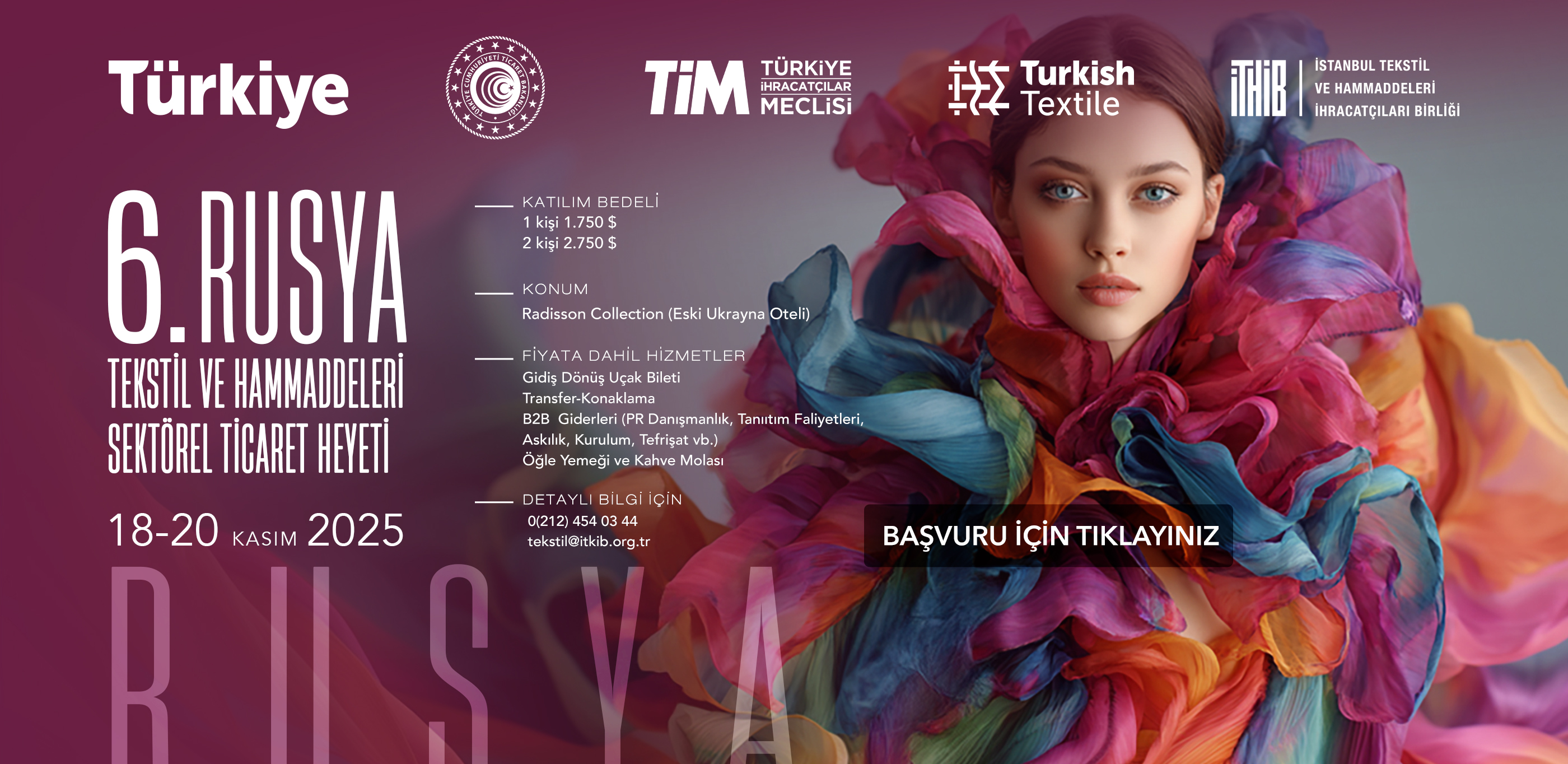 İTKİB-İstanbul Tekstil ve Konfeksiyon İhracatçı Birliklerinden alınan bir yazıda, İTKİB bünyesindeki Birliklerden İstanbul Tekstil ve Hammaddeleri İhracatçıları Birliği (İTHİB) tarafından, katma değerli ihracat hedeflerine ulaşmak ve küresel ihracattan daha fazla pay alınabilmesini teminen ticaret ve alım heyetlerinin organize edildiği, bu defa, Rus ve çevre ülkelerden gelecek firmalara yönelik giyimlik dokuma kumaş, örme kumaş ve tekstil aksesuarları ürün gruplarında Rusya Ticaret Heyeti organizasyonunun planlandığı bildirilmektedir.