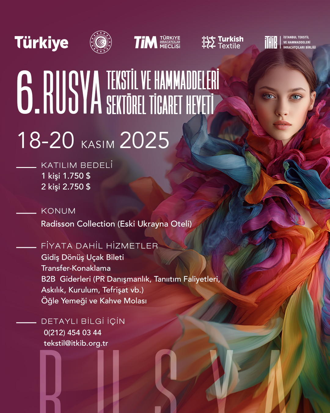 İTKİB-İstanbul Tekstil ve Konfeksiyon İhracatçı Birliklerinden alınan bir yazıda, İTKİB bünyesindeki Birliklerden İstanbul Tekstil ve Hammaddeleri İhracatçıları Birliği (İTHİB) tarafından, katma değerli ihracat hedeflerine ulaşmak ve küresel ihracattan daha fazla pay alınabilmesini teminen ticaret ve alım heyetlerinin organize edildiği, bu defa, Rus ve çevre ülkelerden gelecek firmalara yönelik giyimlik dokuma kumaş, örme kumaş ve tekstil aksesuarları ürün gruplarında Rusya Ticaret Heyeti organizasyonunun planlandığı bildirilmektedir.