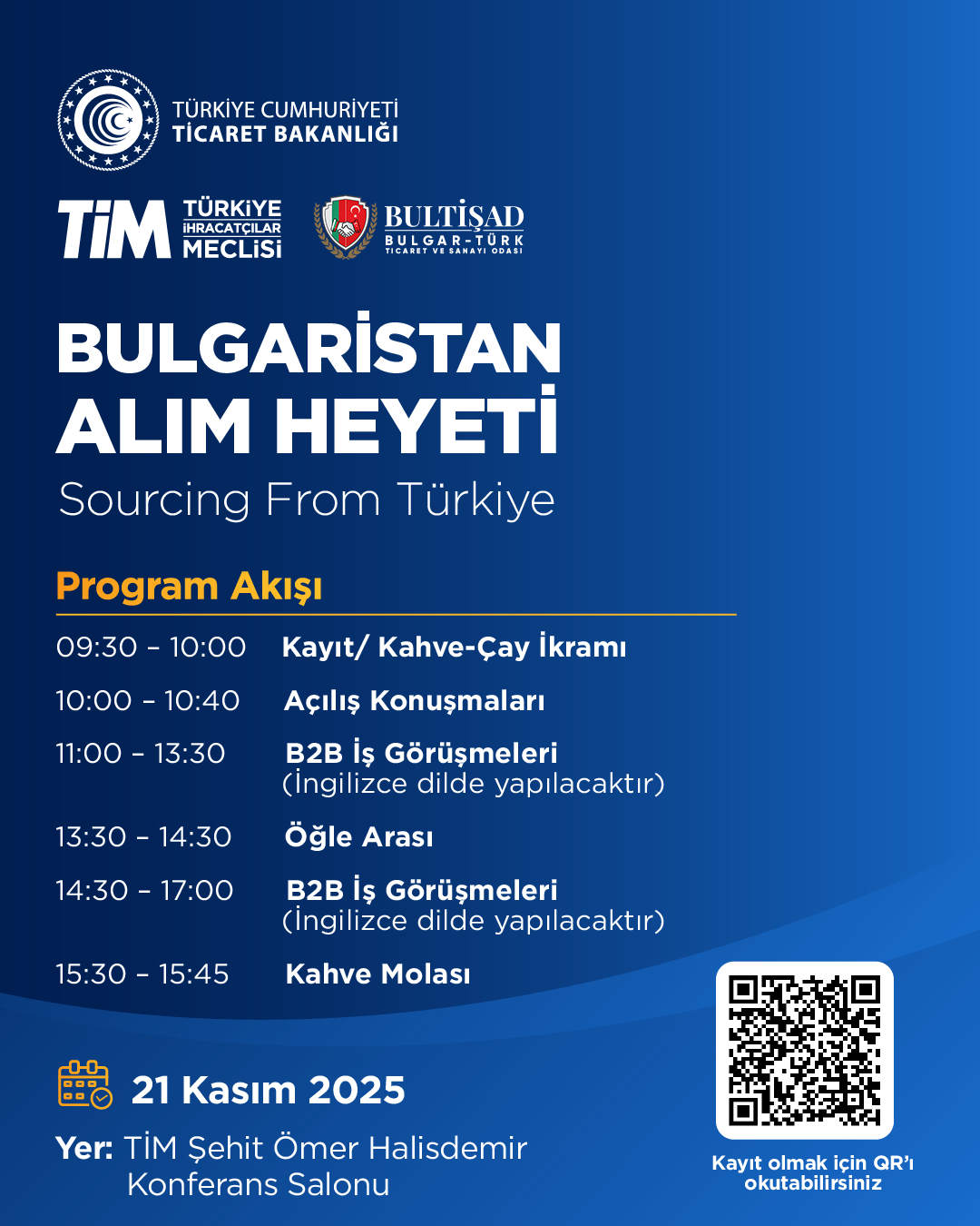 Türkiye İhracatçılar Meclisinden alınan bir yazıda; T.C. Ticaret Bakanlığı koordinasyonu, TİM ve Bulgar Türk Ticaret ve Sanayi Odası iş birliği ile gerçekleştirilmesi planlanan “Bulgaristan Alım Heyeti B2B Görüşmeleri” etkinliğinin başta Demir ve Demirdışı Metaller, Makine ve Aksamları, Otomotiv ve Yan Sanayi, Tekstil ve Hazır Giyim ve Ürünleri, İnşaat ve Yapı Malzemeleri, Elektrik-Elektronik, Gıda Ürünleri ve Kimyevi Maddeler ve Mamulleri olmak üzere tüm sektörlere açık olduğu bildirilmektedir.