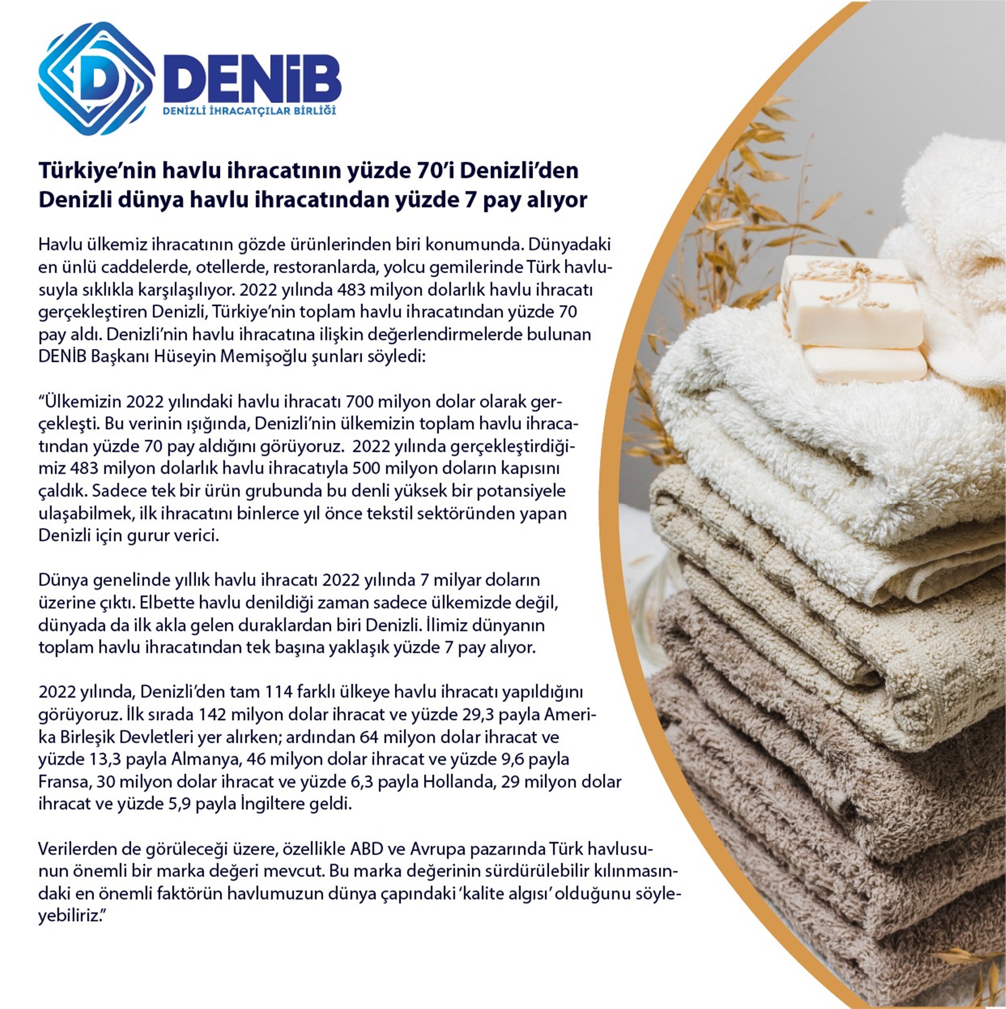 Havlu ülkemiz ihracatının gözde ürünlerinden biri konumunda. Dünyadaki en ünlü caddelerde, otellerde, restoranlarda, yolcu gemilerinde Türk havlusuyla sıklıkla karşılaşılıyor. 2022 yılında 483 milyon dolarlık havlu ihracatı gerçekleştiren Denizli, Türkiye'nin toplam havlu ihracatından yüzde 70 pay aldı. Denizli'nin havlu ihracatına ilişkin değerlendirmelerde bulunan DENİB Başkanı Hüseyin Memişoğlu şunları söyledi: