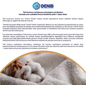 “Denizli İhracatçılar Birliği olarak 'Turkish Towels' markamızla sektörel yurt dışı pazarlama programlarında yer alıyor, havlu denildiğinde akla gelen ilk tedarikçi olma hedefimizle faaliyetlerimizi sürdürüyoruz. Öte yandan, Turkish Towels Turquality projemizin ikinci dönemindeyiz. Farklı sponsorluklar ve etkinliklerle Türk havlusunun tanıtımını dünyanın dört bir yanında sürdürüyoruz.